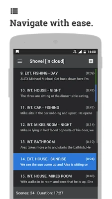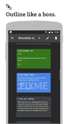 • export notes and scripts to pdf, fdx, fountain docx and kitsp formats in any of the installed applications (mail, Dropbox, Google Drive etc.).