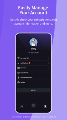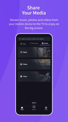 It provides all of the functions of your TV remote and more. Key Features: - Power On / Off - Volume Control - Change Channel - Share Video / Music / Photo to TV - Search VoD